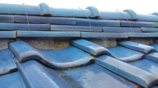 和形、赤褐瓦別名塩焼き瓦、瓦を焼き上げる段階で塩を入れ焼き上げたために塩害には大変強い瓦ですが、現在では1件の窯元でしか製造していません。大棟、のし瓦のずれ、軒先面戸漆喰のはがれ、棟を積み直し、軒先にプラスチック面戸を取り付ければ20年位は大丈夫でしょう。