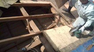 一色のT邸瓦屋根の雨漏り現場です。2階の雨樋の排水マスがつまってしまっていたために、雨水が樋から滝のようにあふれ1階部分の瓦の一部分に集中して落ちていたための雨漏りです。風向きにより雨漏りしていたために、長年放置してしまったために、瓦の下の野地板も交換しなければなりません。