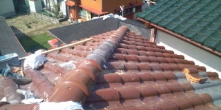 三崎の工事途中の洋瓦屋根の隅棟の取り直し現場です。先週が雨の日ばかりで工程が大幅にくるってしまいやっと三崎に行けました。隅棟の7寸丸瓦が気圧の変化で飛ばされ桟瓦も飛ばされた丸瓦により破損しています。今回は飛びにくくするために棟金具工法で補修いたしました。棟の中に棟金具を取り付け桟木を取り付けます。桟木にシリコン入り南蛮漆喰を盛り丸瓦を取り付けステンレスビス2本で固定します。現在ではこの工法が主流です。